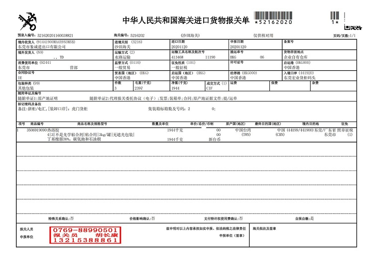 進(jìn)口臺(tái)灣熱溶膠東莞虎門港清關(guān)